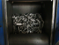 Kapasitesi : 100 Kg. Yükseklik : 60 cm. Genişlik : 66 cm. Tambur tipi kumlama cihazımız 100 kg kapasiteye sahip olup parçanın sertliğine uygun olarak seçtiğimiz çelik bilyeleri kullanmaktayız. Girift ve küçük parçaların tabla tipi kumlama cihazında kumlanması sonucunda iyi bir kumlama neticesi alınamadığından, bu tür parçaların tambur tipi kumlama makinesinde kumlanması daha doğrudur. Parçalar makine içerisinde dönerek kumlanır ve kumlama süresi daha kısa olduğundan daha verimli çalışılmaktadır.